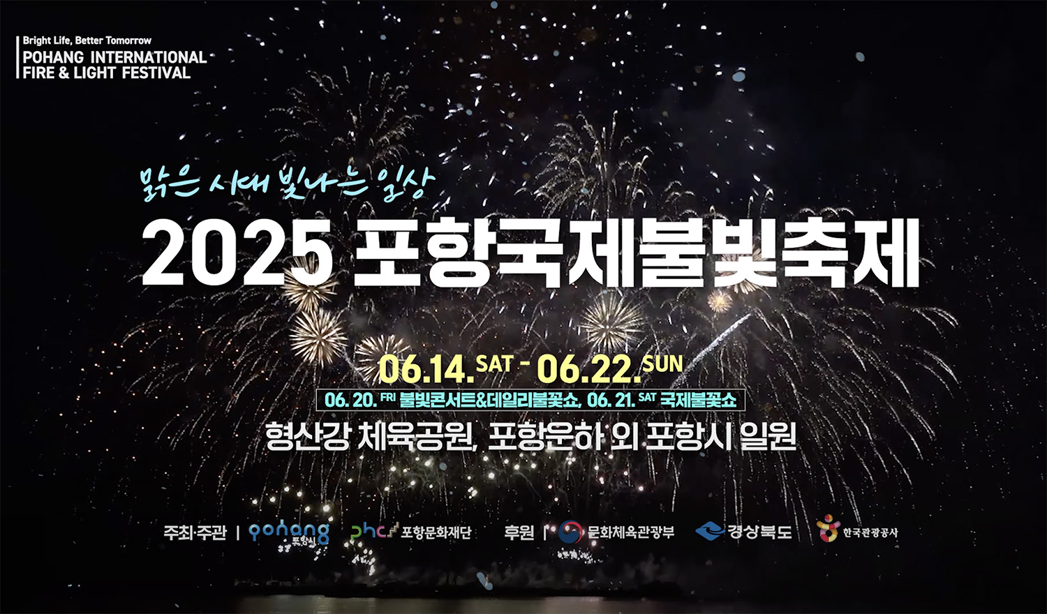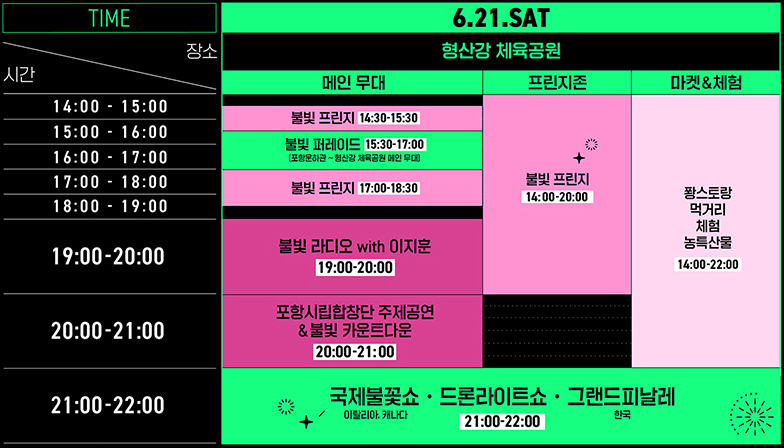 올해 축제는 ‘빛’을 주제로 사전 행사와 본행사로 나뉘어 진행됩니다. 6월 14일부터는 포항운하 라이트웨이, 송도해수욕장 등지에서 테마 불빛존과 프린지 공연 등 사전 프로그램이 열리고 본행사는 6월 20일부터 사흘간 형산강 체육공원에서 진행되며, 21일에는 메인행사인 캐나다와 이탈리아가 참여하는 국제 불꽃쇼와 함께 국내 그랜드 피날레, 드론 라이트쇼가 펼쳐질 예정입니다.